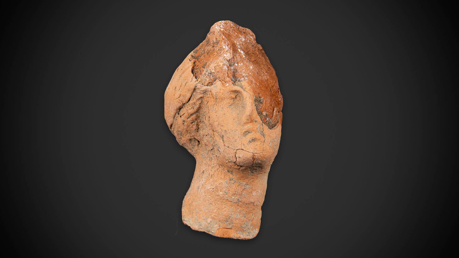 (2): Cabeza de 4,2 cm de alto tiene rasgos faciales son claramente helenísticos. Con un peinado acabado en una especie de moño con una serie de estrías a modo de redecilla. Los modelos clásicos más cercanos de esta pieza suelen relacionarse con las diosas maternales Demeter o Ceres y sus sacerdotisas.